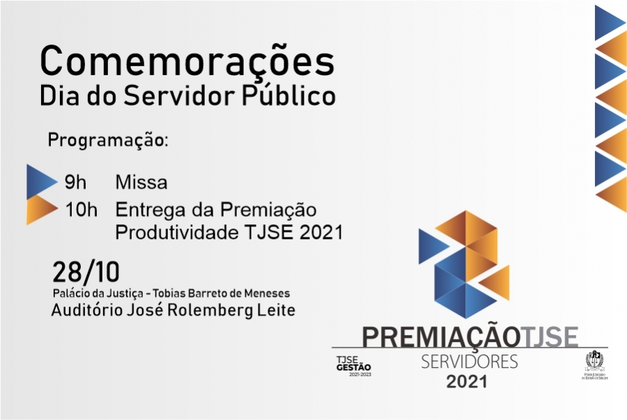 Em comemoração ao Dia do Servidor Público, o Tribunal de Justiça de Sergipe realizará na quinta-feira, dia 28/10, às 9h, no Palácio da Justiça, Missa e entrega da Premiação de Produtividade 2021.