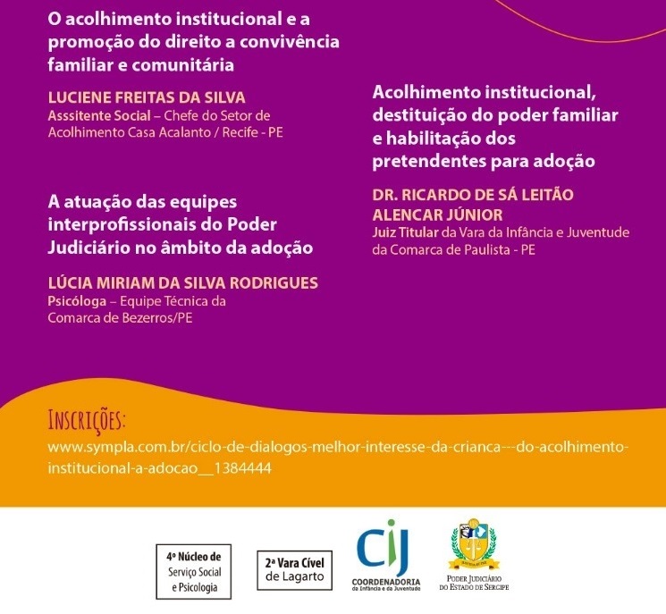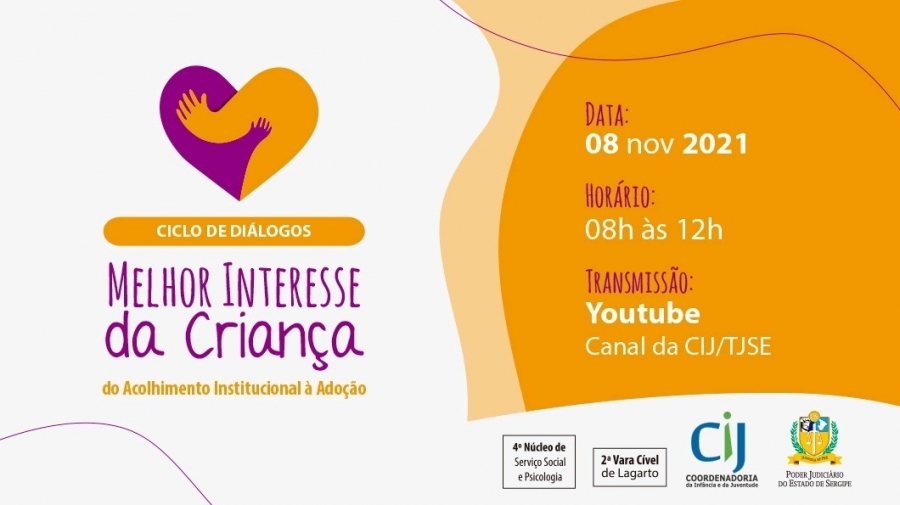 A Coordenadoria da Infância e da Juventude (CIJ) e a Comarca de Lagarto, do Tribunal de Justiça de Sergipe (TJSE), promoverão no dia 08/11, das 8 às 12h, o Ciclo de Diálogos: Melhor Interesse da Criança - do Acolhimento Institucional à Adoção.