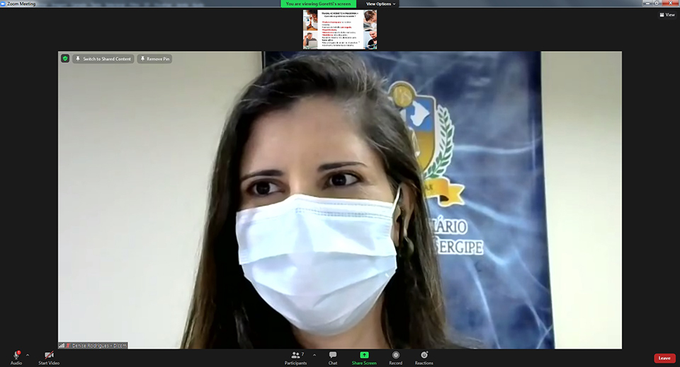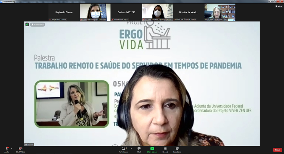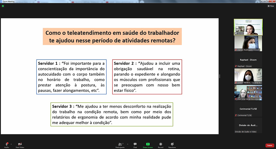 Ainda durante a palestra, Gorette lembrou que o projeto Ergo Vida, do Centro Médico do TJSE, funcionou remotamente durante a pandemia. “Alguns servidores fizeram exercícios e terapia laboral com a gente pelo teleatendimento. O Centro Médico deu todo suporte para os servidores participarem e os encontros estão acontecendo até hoje, com grupos às terças e quartas, de 30 minutos cada. Recebi várias devolutivas dos servidores, que falaram que isso ajudou no período de atividade remota”, contou.