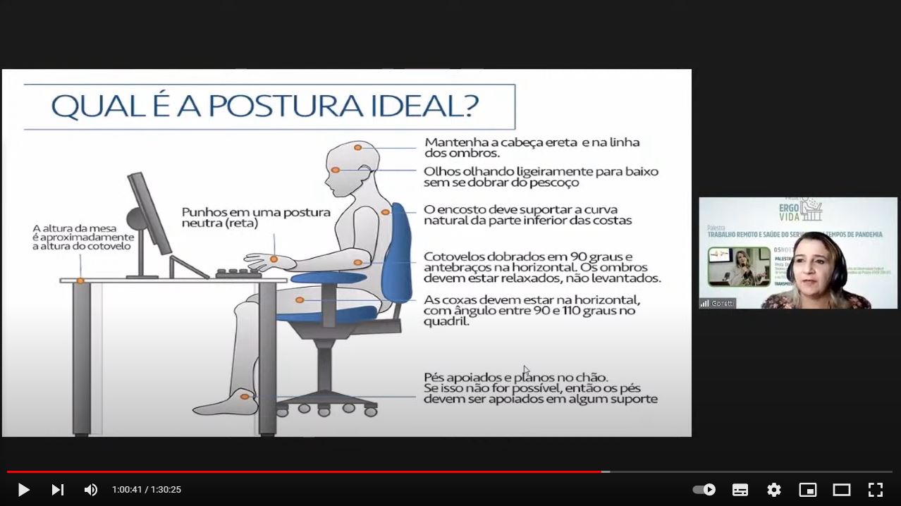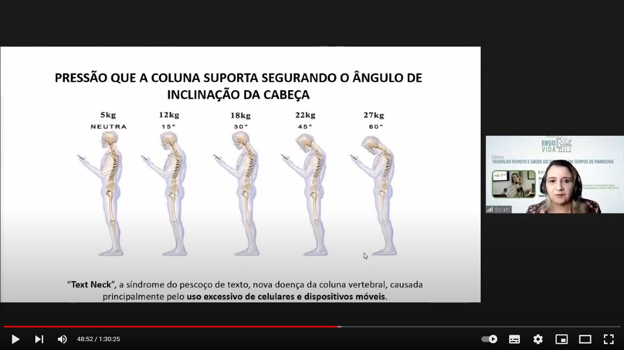 Logo no início da palestra, a fisioterapeuta lembrou que o trabalho remoto adotado durante a pandemia estendeu a carga de trabalho em 10%, segundo a Organização Mundial de Saúde (OMS). “Outro dado importante foi que 70% dos entrevistados disseram jamais terem vivido um ano tão estressante quanto o de 2020”, acrescentou Gorette, lembrando que, nesse período, houve uma explosão de doenças ocupacionais, entre elas lesões por esforços repetitivos, estresse, ansiedade, alterações do sono, cefaleia e cansaço.