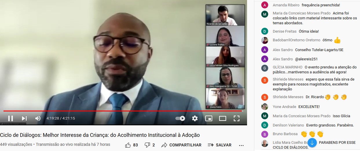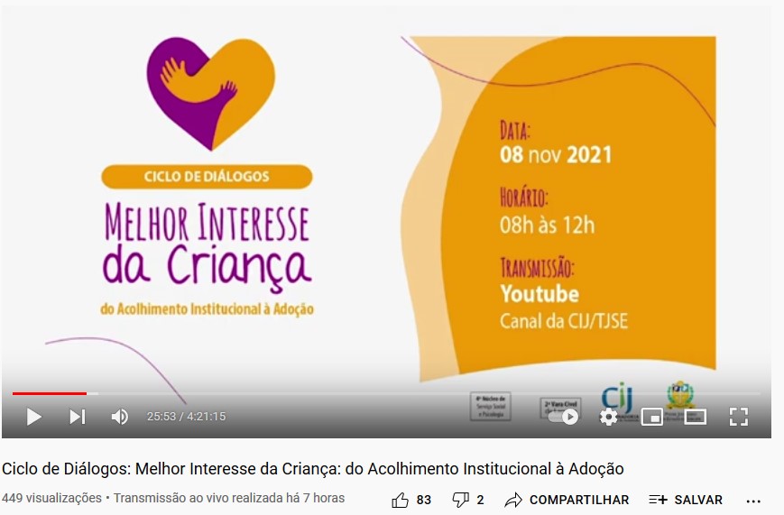 ‘Melhor Interesse da Criança - do Acolhimento Institucional à Adoção’ foi o tema de um Ciclo de Debates promovido pela Coordenadoria da Infância e da Juventude (CIJ) e a Comarca de Lagarto, do Tribunal de Justiça de Sergipe (TJSE). O evento foi realizado na manhã desta segunda-feira, 08/11, e contou com a participação de técnicos e magistrados que atuam na área da infância e juventude. Como foi transmitido pelo canal CIJSE, no YouTube, o evento reuniu profissionais de outros Estados, a exemplo de Pernambuco, Paraná, Espírito Santo e Santa Catarina.