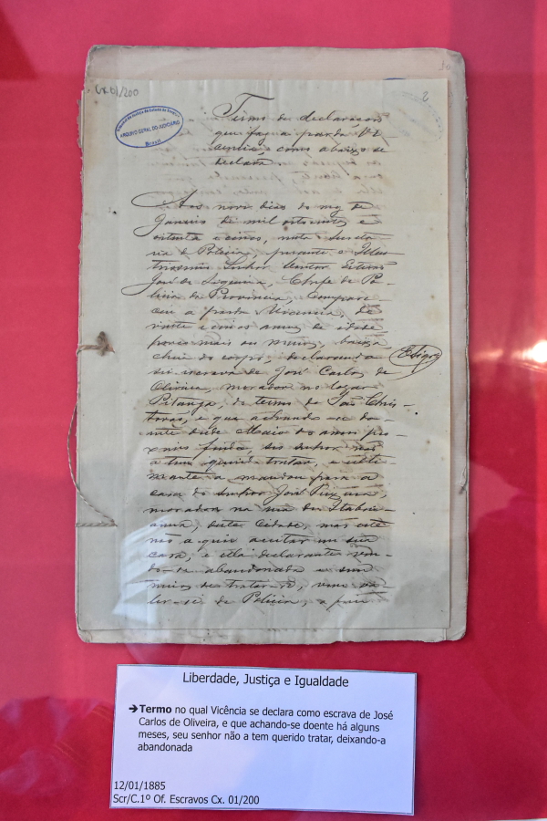 Na exposição Liberdade, Justiça e Igualdade, os visitantes puderam conferir um documento datado de 1886, o qual contém uma lista de escravos libertos pela Lei do Sexagenário, bem como os ofícios da época que foram encaminhados aos senhores de escravos para cumprimento do Decreto nº 9517, de 1885 e da referida lei. Também um documento, datado de 1885, expondo a denúncia, contra o senhor de escravo José Carlos Oliveira, vinda de uma mulher escravizada de nome Vicência, que estando doente, estava em situação de abandono. Em outro documento, de 1887, consta a relação de escravos libertos e suas respectivas profissões.