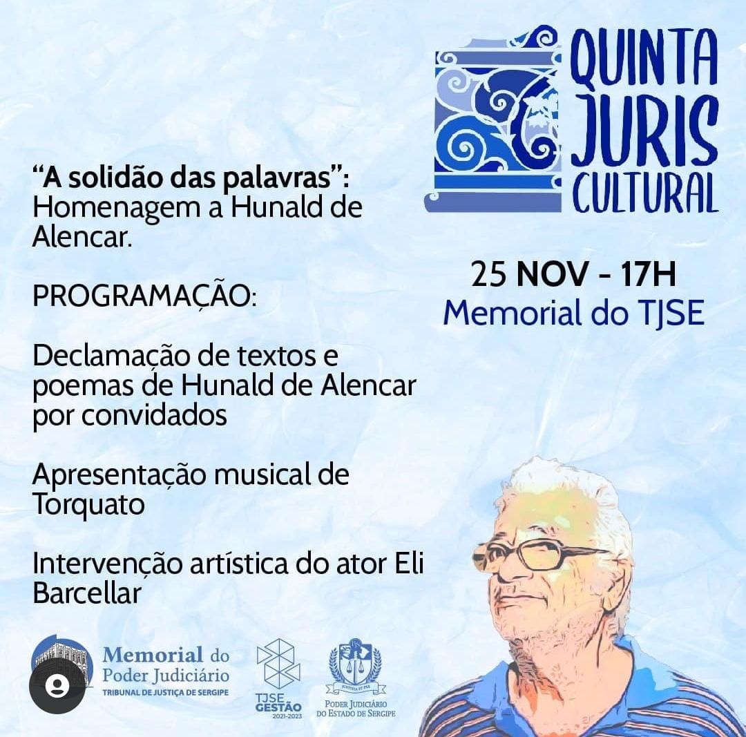 ‘A solidão das palavras’ foi o tema da homenagem feita ao poeta e dramaturgo Hunald de Alencar durante a quinta edição da Quinta Juriscultural, projeto do Tribunal de Justiça de Sergipe (TJSE) realizado no Memorial do Judiciário, Centro de Aracaju, na noite desta quinta-feira, 25/11. Na ocasião, também aconteceu um sarau com declamação de poemas do homenageado, apresentação musical de Torquato e intervenção artística de Eli Bacellar.