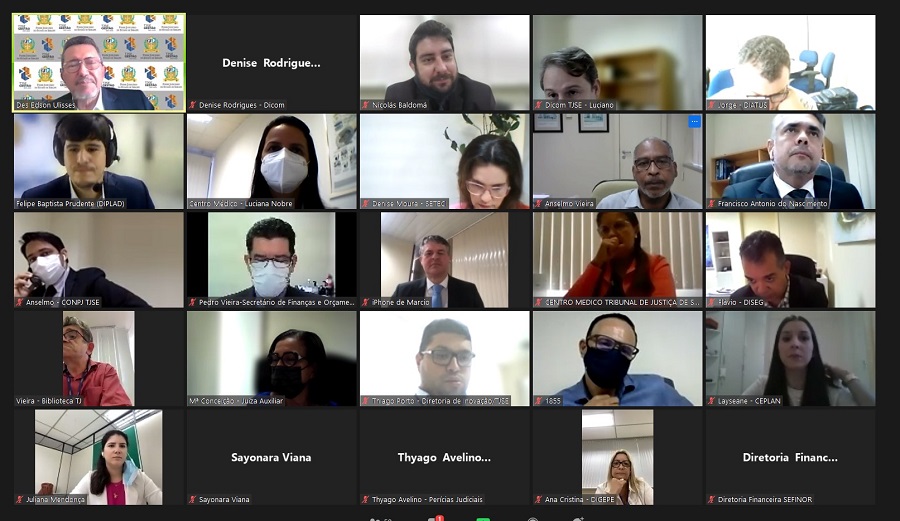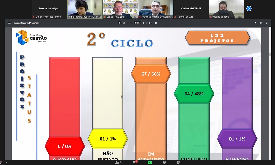 Foi realizada a sétima e última reunião de 2021 do Comitê de Acompanhamento do Plano de Gestão (Caplag) do biênio 2021-2023 do Tribunal de Justiça de Sergipe (TJSE). A reunião, que ocorreu na manhã desta sexta-feira, 26/11, por meio de videoconferência, reuniu a Presidência do TJSE, Secretários, Diretores, que são gestores de projetos, e oportunizou o acompanhamento dos projetos do 2º ciclo da Gestão 2021-2023.