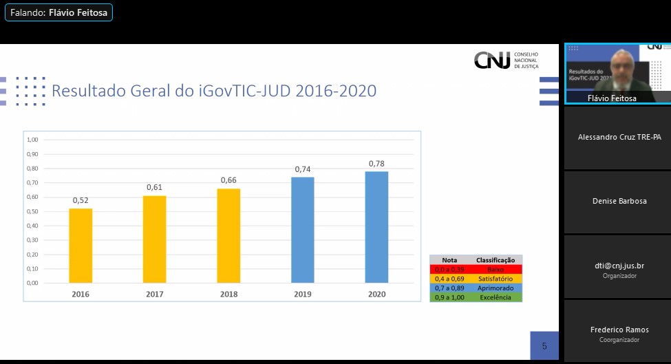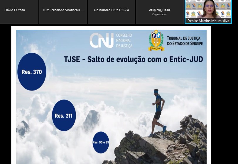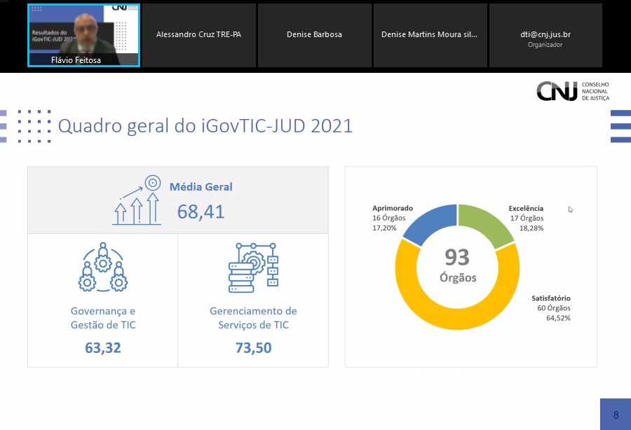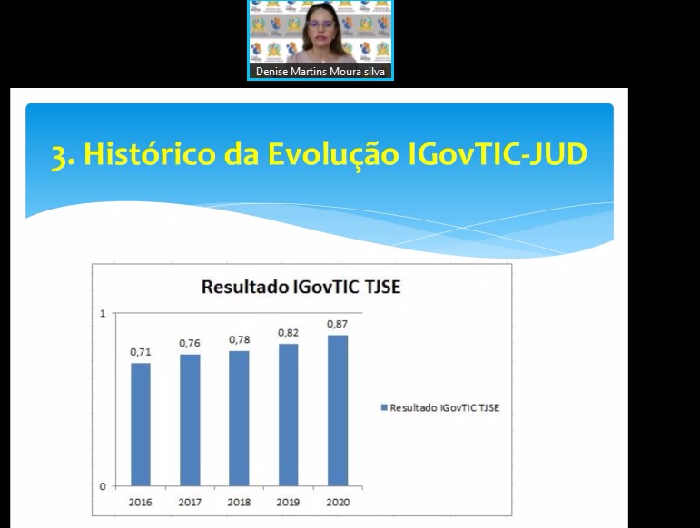 O Conselho Nacional de Justiça (CNJ) realizou um evento online, na tarde desta terça-feira, 30/11, para apresentar os resultados do Índice de Governança, Gestão e Infraestrutura de Tecnologia da Informação e Comunicação do Poder Judiciário (iGovTIC-JUD). O Tribunal de Justiça de Sergipe (TJSE) alcançou o segundo melhor índice entre todos Tribunais Estaduais, 89.73, sendo classificado no nível de excelência, que é quando os Tribunais atingem uma pontuação de 80 a 100. A média geral nacional foi de 68,41 e, entre os Tribunais de pequeno porte, 66,13. A Secretária de Tecnologia da Informação do TJSE, Denise Martins, apresentou alguns dados.