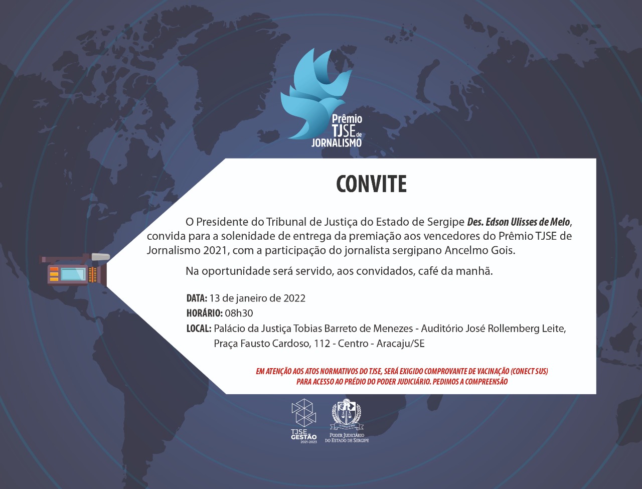 ‘De Frei Paulo para o Brasil: a trajetória de um jornalista sergipano’ será o tema da palestra de Ancelmo Gois, durante a entrega do Prêmio TJSE de Jornalismo. A solenidade será realizada na próxima quinta-feira, 13/01, a partir das 8h30, no Palácio da Justiça Tobias Barreto, localizado à Praça Fausto Cardoso, Centro de Aracaju. Na ocasião, serão conhecidos os vencedores das seis categorias do prêmio e será oferecido um café da manhã para a imprensa. Em atenção aos atos normativos do Tribunal de Justiça de Sergipe será exigido o comprovante de vacinação contra a Covid-19 para entrada na solenidade.