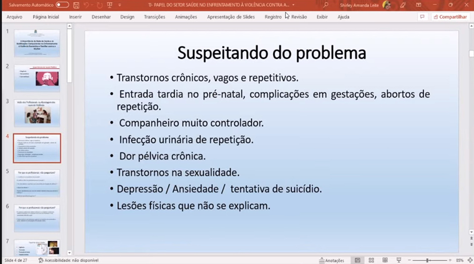 Para Karla, o profissional de saúde tem que saber identificar as mulheres vítimas desde os primeiros sinais de violência, seja ela física ou psicológica. “Isso para que a gente consiga romper esse ciclo da violência desde o início”, salientou. Outro dado apresentado foi referente ao local onde a violência ocorre. De 2017 a 2021, 995 dos casos ocorreram na residência da vítima; 126 em via pública; e 17 em escolas, entre outros lugares. Karla informou ainda que o Serviço de Atendimento às vítimas de violência sexual funciona na Maternidade Nossa Senhora de Lourdes, em Aracaju.