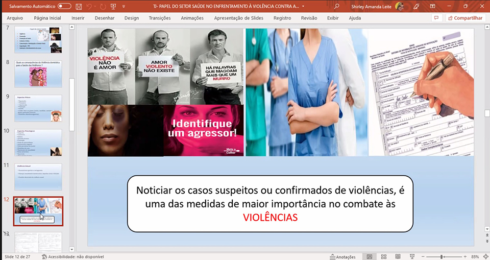 Ela falou ainda sobre o Sistema de Informação de Agravos de Notificação (Sinan), instituído pelo Ministério da Saúde em janeiro de 2011. “O intuito dessa ficha de notificação é justamente sensibilizar os gestores para que possam pensar o serviço de saúde para acolher e atender a mulher em situação de violência e que sejam planejadas ações de prevenção nos territórios”, explicou Lidiane. A segunda palestrante foi Karla Danielly Anacleto, Referência Técnica do Núcleo de Prevenção à Violência e Acidentes (Nupeva) da Secretaria de Estado da Saúde. Ela apresentou um panorama da violência contra a mulher.