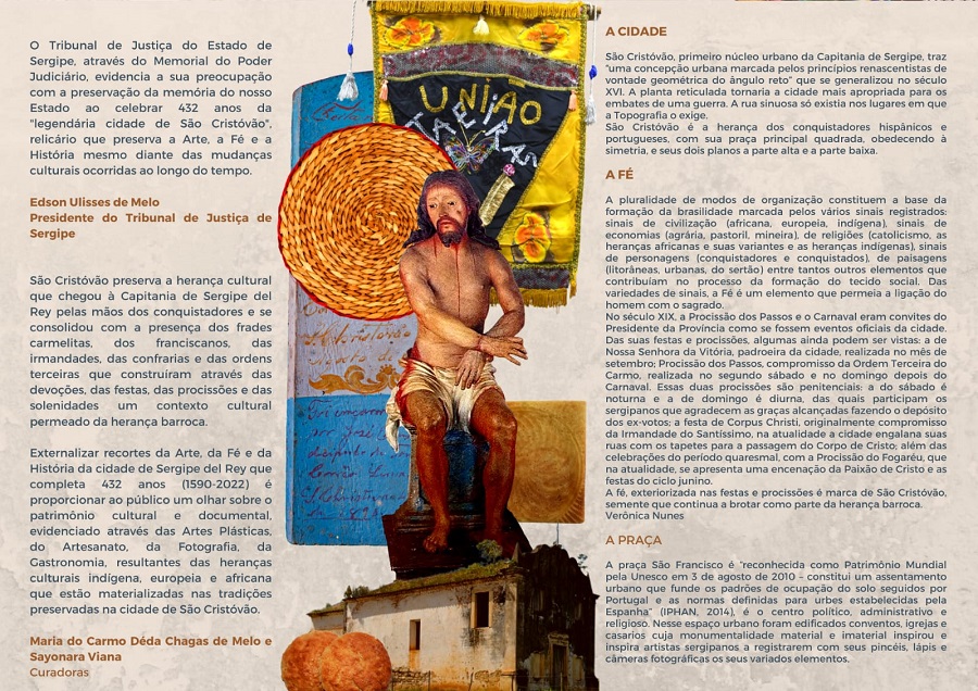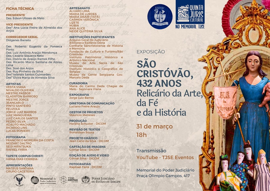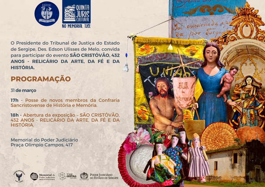 Será aberta na próxima quinta-feira, 31/03, a partir das 17 horas, no Memorial do Judiciário, a exposição "São Cristóvão - 432 anos: relicário da arte, da fé e da história". Na mesma ocasião, haverá a posse dos novos membros da Confraria Sancristovense de História e Memória. Os eventos integram mais uma edição do Projeto Quinta Juriscultural, que tem como curadoras Maria do Carmo Deda Chagas de Melo e Sayonara Viana, Diretora do Memorial.