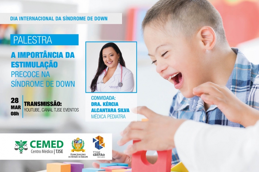 "Importância da estimulação precoce na Síndrome de Down" é o tema de uma palestra que acontecerá na próxima segunda-feira, 28/03, a partir das 8 horas, no canal TJSE Eventos, no YouTube. A palestra será ministrada pela médica pediatra Kércia Alcântara Silva. O evento é alusivo ao Dia Internacional da Síndrome de Down, comemorado em 21 de março.