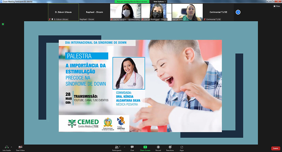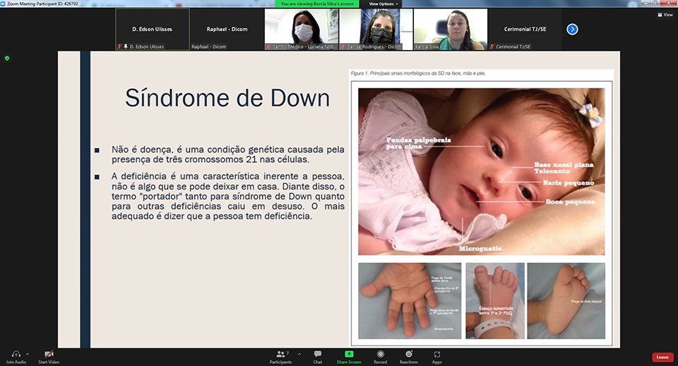 O que é Síndrome de Down e a importância da estimulação precoce foi o tema de uma palestra realizada na manhã desta segunda-feira, 28/03, no canal TJSE Eventos, no YouTube, onde ficou gravada. O tema foi abordado pela médica pediatra Kércia Alcântara Silva. O evento foi alusivo ao Dia Internacional da Síndrome de Down, comemorado em 21 de março. Estima-se que no Brasil existam cerca de 300 mil pessoas com Síndrome de Down.