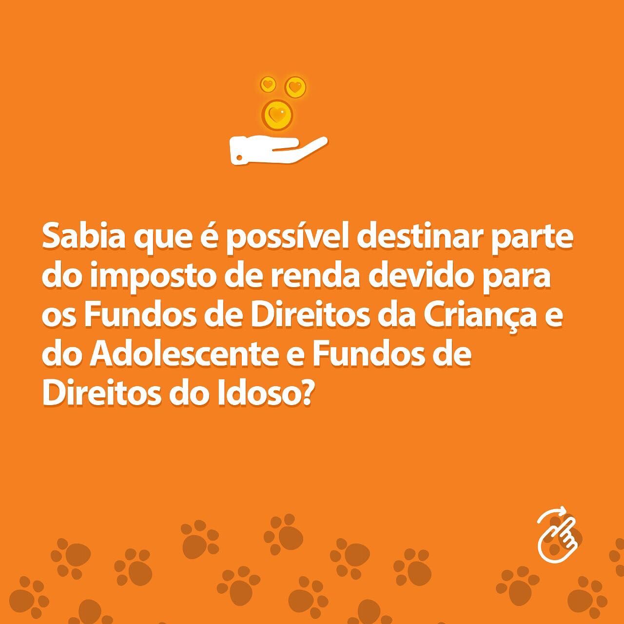 Tendo imposto a pagar ou a restituir, no modelo de Declaração Completa, é possível destinar até 3% do valor do Imposto de Renda Pessoa Física para os Fundos dos Direitos da Criança e do Adolescente e/ou 3% para os Fundos dos Direitos do Idoso, totalizando até 6%. Caso você faça a Declaração Simplificada também pode ajudar compartilhando essa informação.
