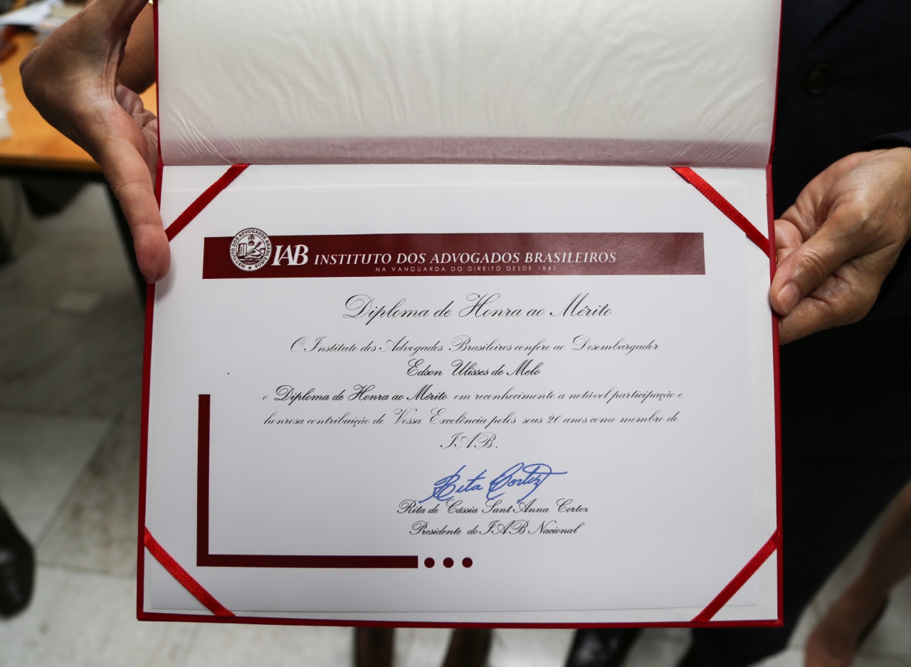 “O IAB já tem 178 de existência. O Desembargador Edson é nosso sócio honorário há 20 anos. Para quem não sabe, os sócios honorários são aqueles de carreira jurídica que não são advogados atualmente. Então, viemos prestar essa homenagem dando um diploma de honra ao mérito ao Desembargador Edson Ulisses”, explicou a Presidenta da IAB, Rita Cortez.