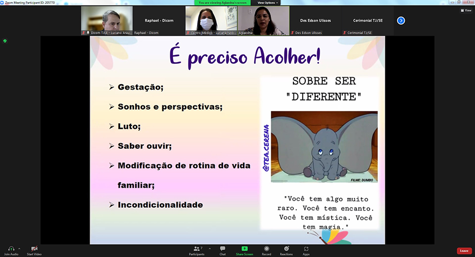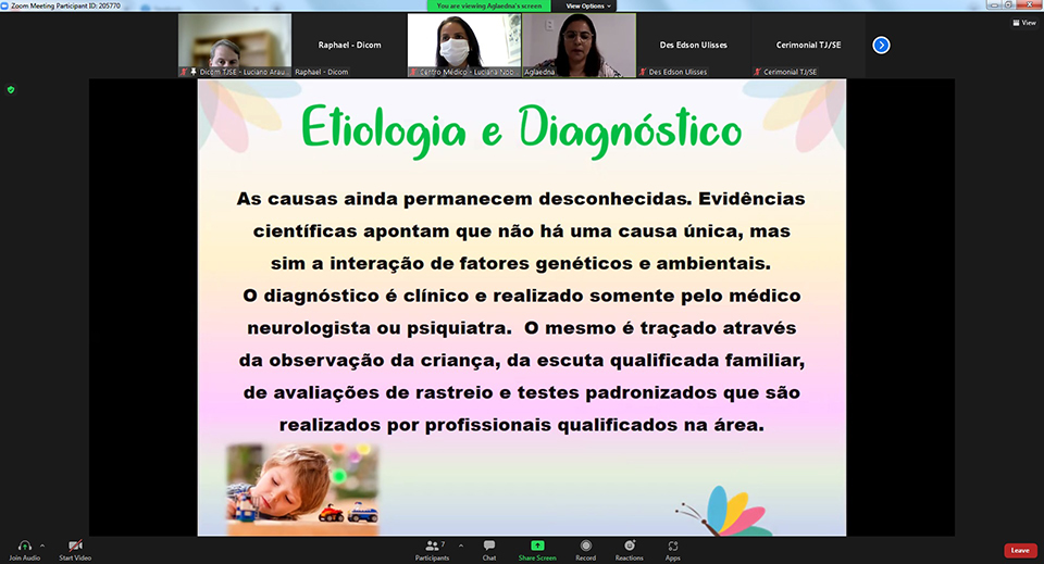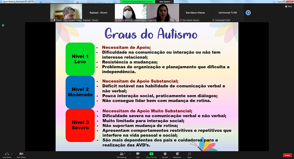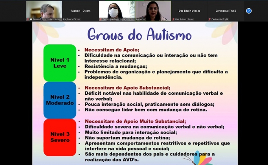 O Tribunal de Justiça de Sergipe (TJSE), através do seu Centro Médico, realizou na manhã desta segunda-feira, 18/04, mais uma palestra do Projeto Meses Coloridos. Desta vez, o tema foi a conscientização sobre o autismo, abordado por Aglaedna Oliveira Brito, mãe atípica, terapeuta ocupacional, especialista em Transtorno do Espectro Autista (TEA) e reorganização sensorial no autismo. O evento foi transmitido no canal TJSE Eventos, no YouTube, onde ficou gravado.
