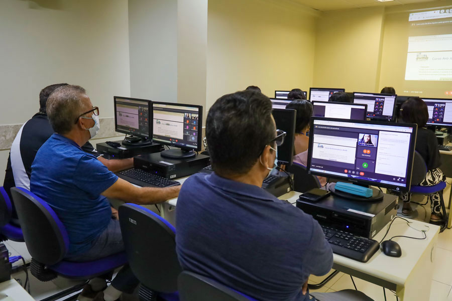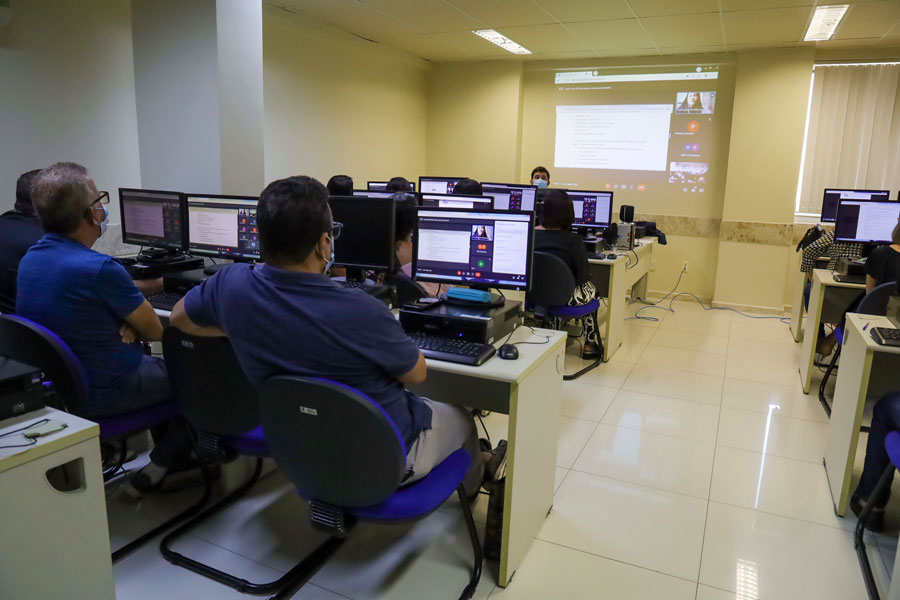 Os participantes acessam o ambiente virtual, por meio da Plataforma Google Meet, e acompanham as aulas síncronas na modalidade on-line ao vivo.