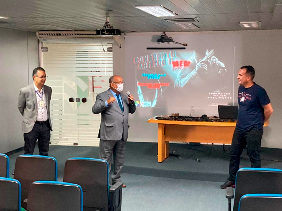 “O curso é voltado para defesa pessoal, com técnicas muito específicas para o dia a dia deste público, que são os agentes de segurança e também os magistrados. Na aula teórica, abordamos o uso de técnicas novas, seguras e com muita funcionalidade. Na aula prática, fazemos um laboratório para internalizar a técnica e identificar o objetivo e sua aplicabilidade”, explicou o Major Nascimento, que é também Comandante do Centro de Treinamento Operacional da Polícia Militar e instrutor de tiro.