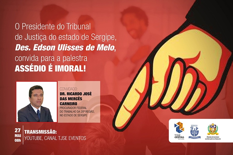 O Tribunal de Justiça de Sergipe (TJSE), por meio da Comissão de Prevenção e Enfrentamento do Assédio Moral, do Assédio Sexual e da Discriminação, realizará na próxima sexta-feira, 27/05, às 8 horas, uma palestra virtual com o tema ‘Assédio é Imoral’, que será ministrada pelo Procurador do Trabalho da 20ª Região, no Estado de Sergipe, Ricardo José das Mercês Carneiro. A palestra será transmitida pelo canal TJSE Eventos, no YouTube.