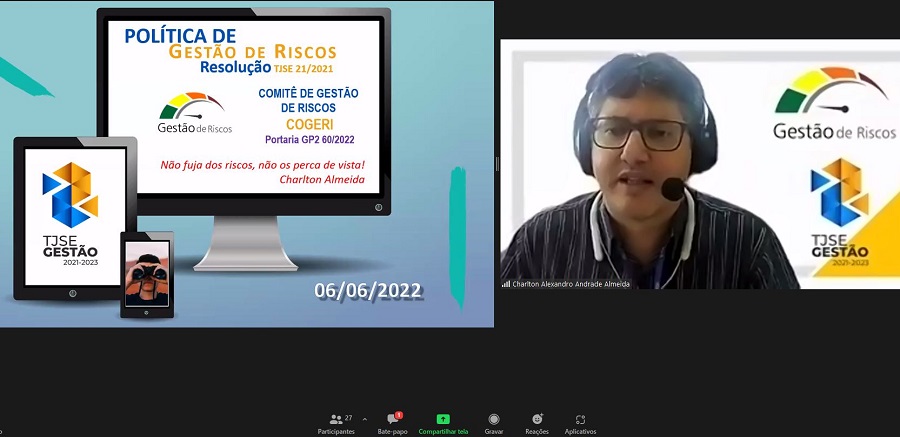 O gestor do projeto informou que já foi criado o Comitê de Gestão de Riscos (Cogeri) e que vêm sendo realizados treinamentos sobre o tema junto à Escola Judicial de Sergipe (Ejuse). A ideia é que a cultura da gestão de riscos seja disseminada no âmbito do TJSE, com aprovação de metodologia, processos de trabalho e modelos de documentação.