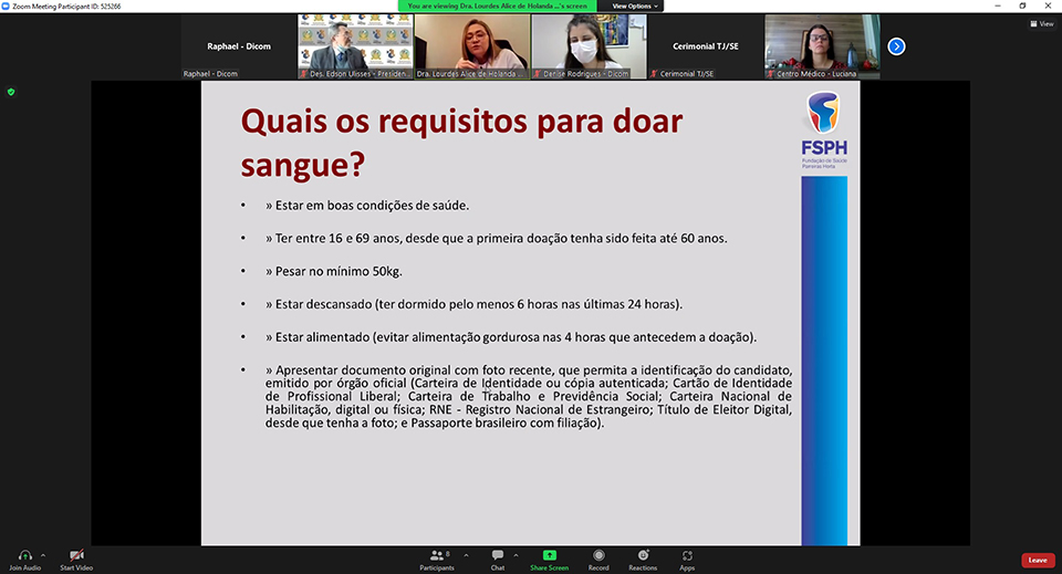 Ainda durante a palestra, foram apresentados os requisitos para quem deseja ser doador de sangue e a nota técnica que atualizou os critérios relacionados à Covid-19. Pessoas com diagnóstico ou suspeita de Covid-19 só podem doar após dez dias do desaparecimento dos sintomas, bem com assintomáticos com resultado positivo.