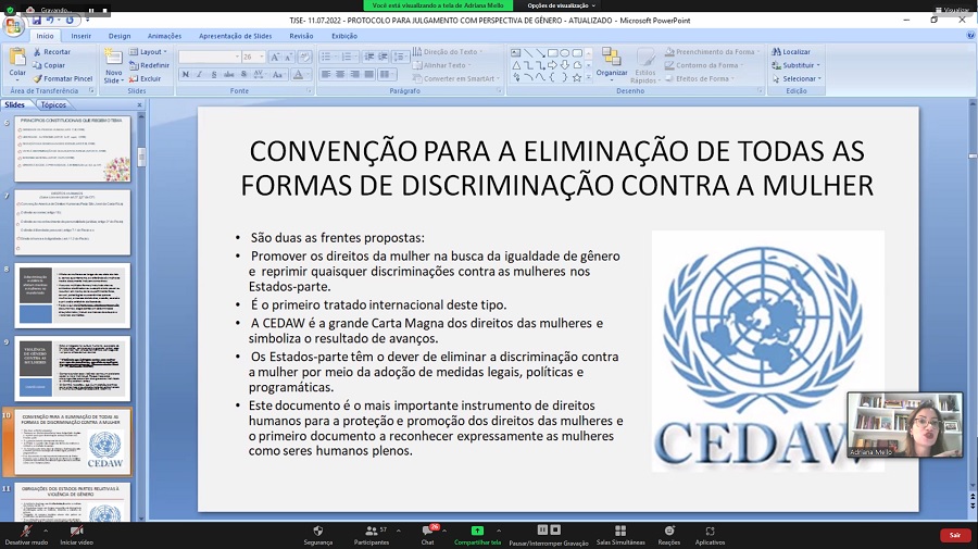 “Parabenizo o TJSE e a Ejuse pela iniciativa de promover uma capacitação tão importante, sobretudo, nesse momento em que o Brasil enfrenta altos índices de desigualdade social, política, de gênero e econômica. Grande parte das mulheres e das pessoas que precisam ter acesso à Justiça vivem em situação de vulnerabilidade, não apenas pela questão de gênero, mas de raça também (a violência contra a mulher negra)”, observou a Adriana Mello, ao destacar que o Brasil assumiu vários compromissos internacionais, como a Convenção para a Eliminação de Todas as Formas de Discriminação Contra as Mulheres, e a Convenção do Belém do Pará, que é a Convenção Interamericana para Prevenir e Erradicar a Violência Contra a Mulher. ”O Brasil vem se comprometendo internacionalmente, e mesmo assim, a gente observa a violação grave dos direitos humanos das mulheres”, alertou.