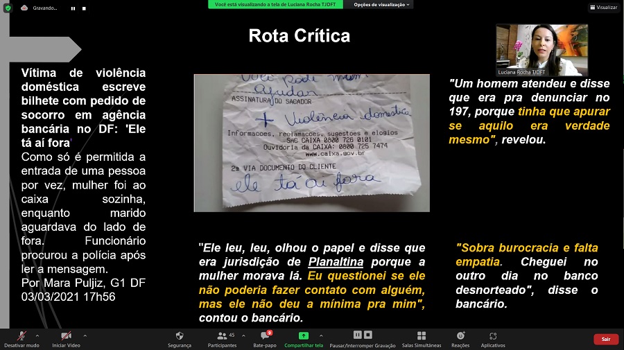 Palestrante: Dra. Luciana Lopes Rocha - Juíza TJDFT Conteúdo programático: Avaliação e gestão de risco em casos de violência contra a mulher; Formulário Nacional de Risco. |