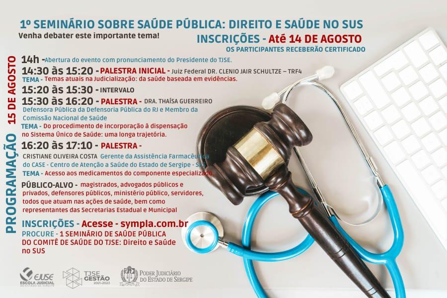 As inscrições acontecem até o dia 14 de agosto pelo endereço https://www.sympla.com.br/1-seminario-de-saude-publica-do-comite-de-saude-do-tjse-direito-e-saude-no-sus__1650786