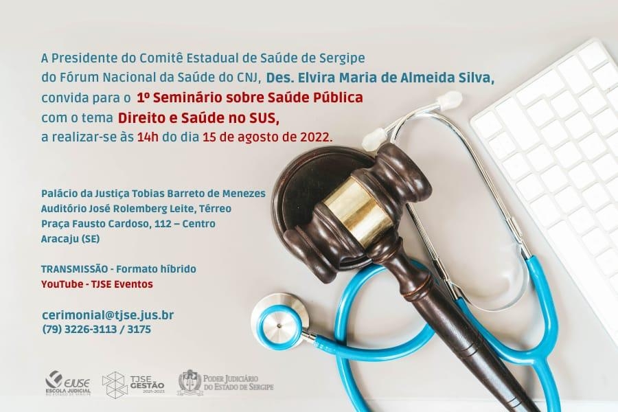 O 1º Seminário sobre Saúde Pública ocorrerá de forma híbrida, presencialmente no Auditório José Rollemberg Leite, no Palácio da Justiça, com transmissão pelo canal TJSE Eventos, no YouTube.