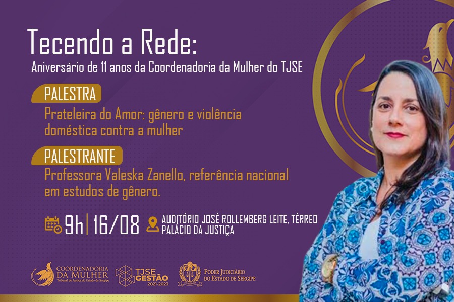 A Coordenadoria da Mulher do Tribunal de Justiça de Sergipe (TJSE) está comemorando 11 anos de criação. Para celebrar a data, será realizada nessa terça-feira, 16/08, às 9 horas, a palestra ‘Prateleira do Amor: gênero e violência doméstica contra a mulher’, ministrada pela professora Valeska Zanello, referência nacional em estudos de gênero. O evento acontecerá no auditório do Palácio da Justiça, no Centro de Aracaju.