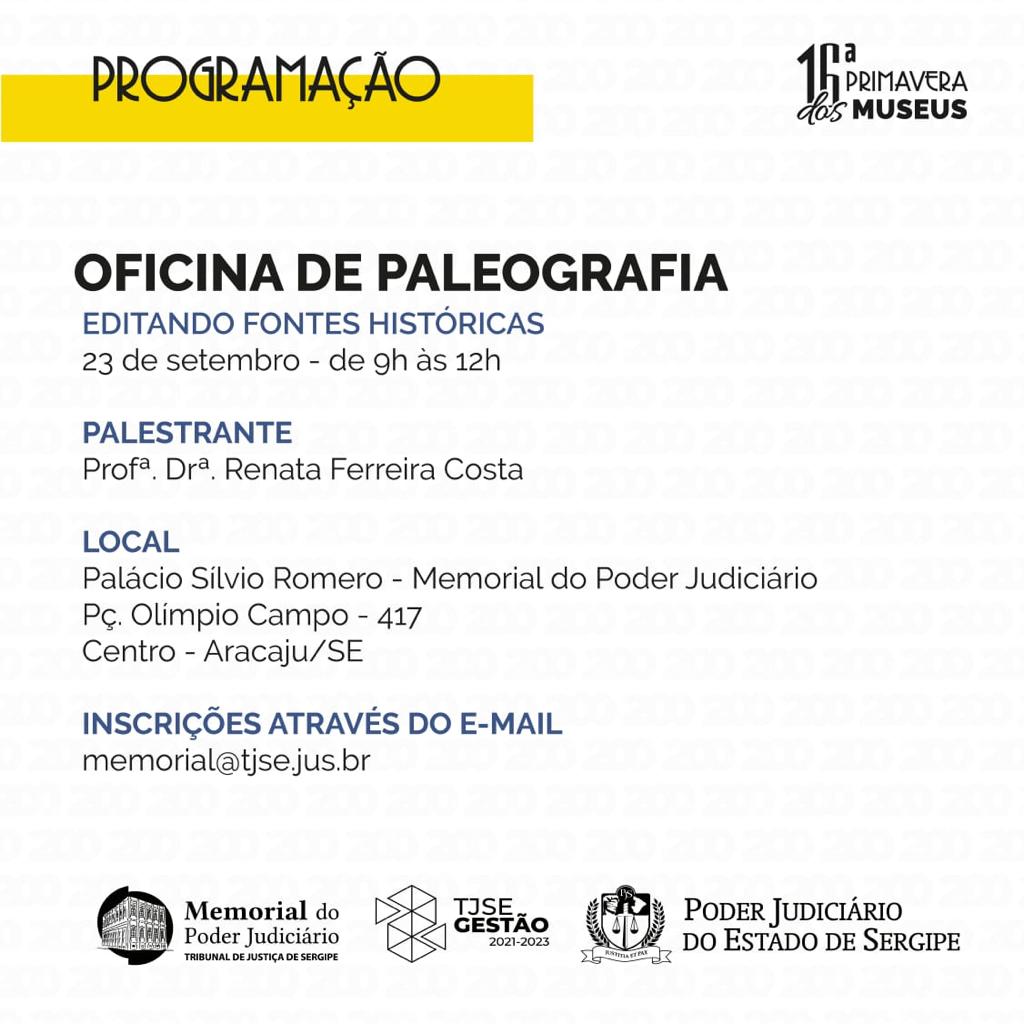 Estão abertas as inscrições para a Oficina de Paleografia "Editando Fontes Históricas", do Memorial do Judiciário. A ministrante será a Professora Doutora Renata Ferreira Costa. As inscrições podem ser feitas através do e-mail Este endereço de email está sendo protegido de spambots. Você precisa do JavaScript ativado para vê-lo.. O evento integra a programação da 16ª Primavera dos Museus.