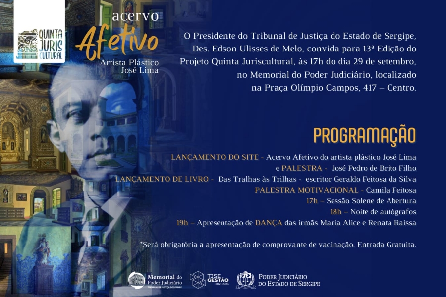 A décima quarta edição do Projeto Quinta Juriscultural acontecerá no próximo dia 29/09, quinta-feira, a partir das 17 horas, no Memorial do Judiciário, Centro de Aracaju. Dessa vez, o tema será "Diálogos Possíveis: Arte e Acessibilidade" com destaque para a obra do artista plástico José Lima, que perdeu parte da audição aos 25 anos, mas tocava órgão, era regente de um coral e foi considerado um dos maiores expoentes da pintura sacra no Brasil. A entrada é gratuita, porém é necessário apresentar comprovante de vacinação contra a Covid-19.