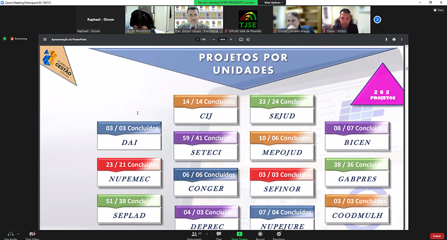O Plano de Gestão tem em seu portfólio um total de 262 projetos, dos quais 79,8% estão concluídos. A eficácia dos projetos, conforme cada um dos cinco eixos, foi apresentada da seguinte forma: Excelência da Área-fim, 79% de eficácia; Cidadania, Diálogo, Cultura e Memória Judiciária, 86%; Transformação Digital, 74%; Pessoas e Gestão, 76%; e Excelência da Área-meio, 81%. O 3º ciclo, que foi analisado pontualmente durante a reunião presidida pelo Presidente do Poder Judiciário de Sergipe Desembargador Edson Ulisses, concentra 31% dos projetos do Plano de Gestão.