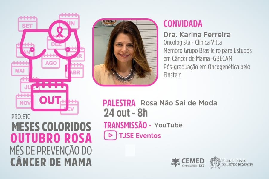 Em alusão ao Outubro Rosa, o Centro Médico do Tribunal de Justiça de Sergipe (TJSE) realizará na segunda-feira, dia 24/10, às 8h, mais uma palestra virtual. Inserida no Projeto Meses Coloridos, a palestra "Rosa Não Sai de Moda" será proferida pela oncologista Karina Ferreira e trará informações sobre prevenção e tratamento ao câncer de mama.