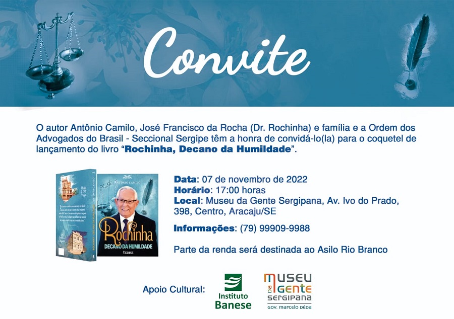 ‘Rochinha – Decano da humildade’ é o título do novo livro de Antônio Camilo, escritor e servidor do Tribunal de Justiça de Sergipe (TJSE). O lançamento do livro acontecerá no próximo dia 7 de novembro, às 17 horas, no Museu da Gente Sergipana. A obra, com quase 300 páginas, relata a trajetória de José Francisco da Rocha, carinhosamente conhecido como Dr. Rochinha, decano dos advogados de Sergipe, com 64 anos de efetivo exercício da advocacia, e professor aposentado de Direito das Universidades Federal de Sergipe (UFS) e Tiradentes (Unit). Trajetória essa mostrada no Projeto Vivas Memórias, do TJSE, em entrevista realizada em 17 de dezembro de 2018 e disponível no canal TJSergipe, no YouTube.