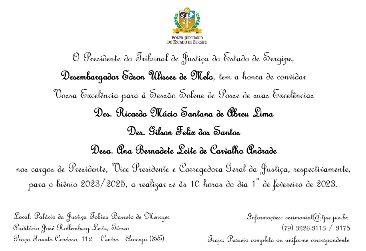 A solenidade será transmitida pelo canal TJSergipe, no YouTube. A Mesa Diretora do biênio 2021-2023 tomou posse em 1º de fevereiro de 2021. Foi composta pelos Desembargadores Edson Ulisses de Melo, Presidente; Ana Lúcia Freire de Almeida dos Anjos, Vice-Presidente; e Diógenes Barreto, Corregedor-Geral da Justiça.