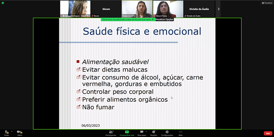 A médica ginecologista Rosita Fiorotto Carvalho, chefe da Divisão Médica do TJSE, abordou a importância da sociedade estar sempre atuando na prevenção. “Quando falamos da saúde da mulher, priorizamos os cuidados e a prevenção do câncer de colo uterino e de mama, porque são os mais prevalentes na mulher. Hoje a gente tem que se preocupar mais com qualidade de vida por meio da prevenção que é o melhor caminho para termos uma saúde física e emocional”, iniciou a abordagem.