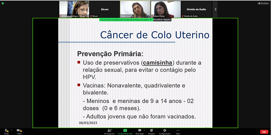 Sobre o câncer de colo uterino, a médica Rosita Fiorotto trouxe os dados do Instituto Nacional de Câncer, os quais mostram a estimativa de casos. Em 2023, no Brasil, a estimativa é de 17.010, em Sergipe, podem acontecer 220 casos e em Aracaju, 40. No Brasil, o câncer de colo uterino é a quarta causa de morte de mulheres por câncer com uma média de 6.385 vítimas fatais por ano. O quantitativo de novos casos a cada ano é de 16.590, sendo que 90% dos casos estão relacionados com o HPV.
