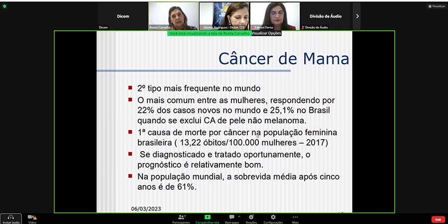 Com relação ao câncer de mama, a palestrante informou que a estimativa de novos casos, para 2023, é de 73.610 no Brasil; em Sergipe, 530 e, em Aracaju, 210 casos. O risco estimado de câncer de mama é de 47,8 casos por grupo de 100 mil mulheres. Em 2020, 17.825 mulheres morreram no Brasil vítimas do câncer de mama.