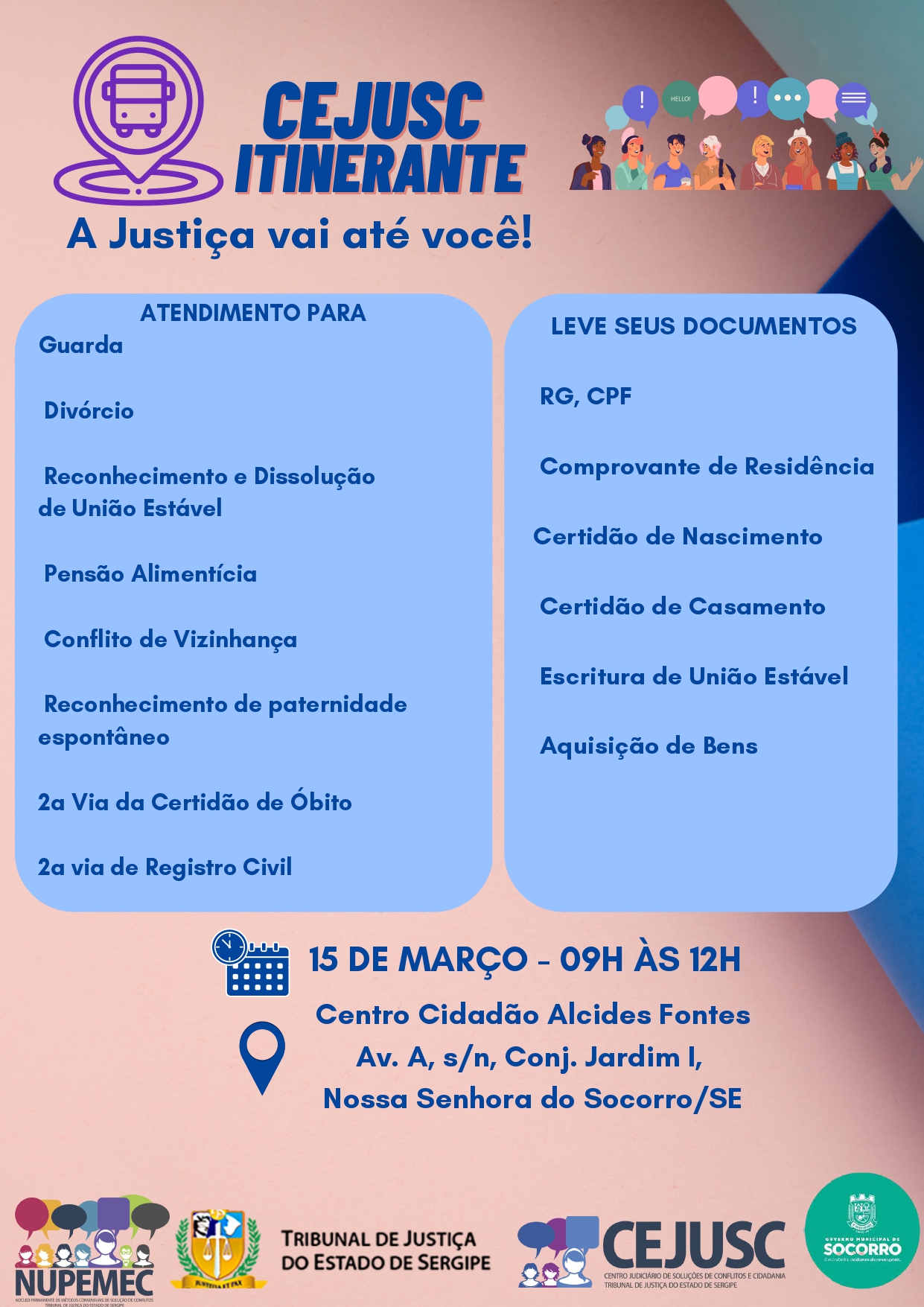 Levar serviços do Tribunal de Justiça de Sergipe (TJSE), especialmente a bairros e povoados onde não há fóruns, é o objetivo de um projeto iniciado na manhã desta quarta-feira, 15/03, no Centro Cidadão Alcides Fontes, localizado no Conjunto Jardim, em Nossa Senhora do Socorro. O Cejusc Itinerante é uma iniciativa do Núcleo Permanente de Métodos Consensuais de Solução de Conflitos (Nupemec), com apoio da Corregedoria Geral da Justiça (CGJ) e Prefeitura de Socorro.