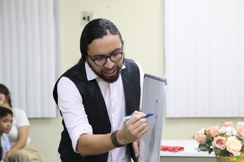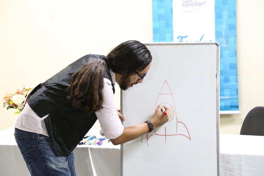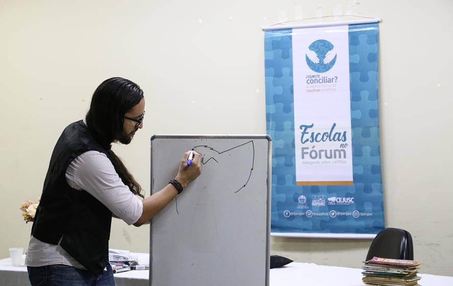 A novidade desta edição do Projeto Escolas no Fórum foi uma oficina de desenho com André Comanche. Ele ingressou no Judiciário em 2009, aos 19 anos, como técnico judiciário. Atualmente, está lotado na 4ª Vara Cível de Socorro. Além de desenhista, também é professor e escritor, com cinco livros publicados. Com muita habilidade e bom humor, André ensinou como as crianças podem fazer inúmeros desenhos a partir de letras e números.