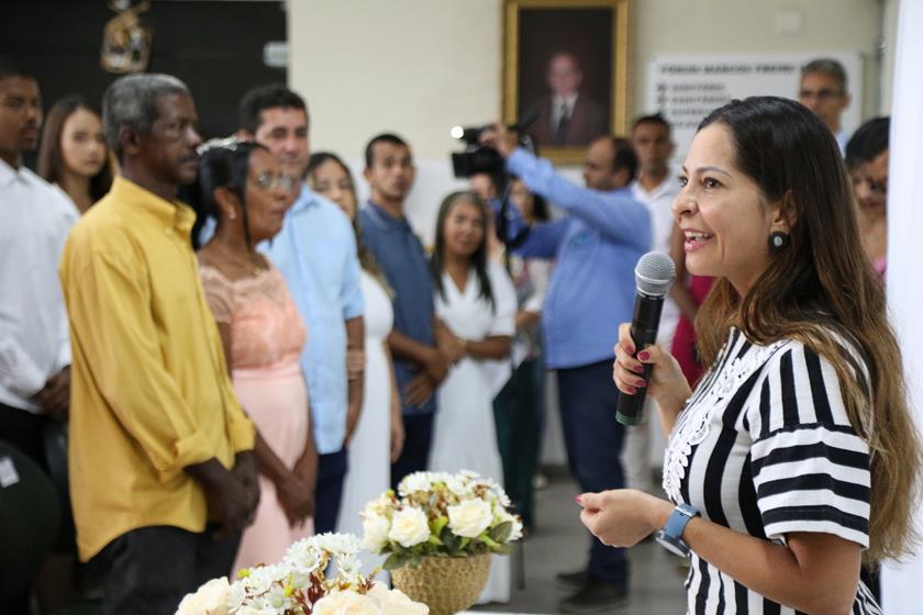 A cerimônia foi celebrada pela juíza Tatiany Nascimento Chagas de Albuquerque, titular da 3ª Vara Cível de Socorro. “O maior laboratório da nossa alma é o convívio com alguém para dividir as alegrias e as adversidades. Viemos a esse planeta para aprendermos o maior ensinamento que existe, que é o amor. E fazer isso ao lado de alguém, apesar de desafiador, é muito, muito bonito”, disse a magistrada durante seu discurso, desejando aos casais sabedoria, maturidade, alegria e amor.