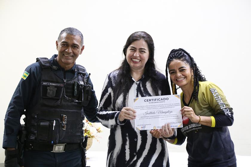 "Uma honra receber esse reconhecimento, a gente só dar essa parcela que é trazer a comunidade para que conheça a realidade do fórum. Quando a comunidade e a cultura estão inseridas, todos ganham. O fórum deixa de ser aquele espaço frio, as pessoas se sentem acolhidas. No fórum a gente é bem recebido pelo nosso amigo juiz, pela nossa amiga juíza, pelo pessoal da coordenação, então, para nós é uma felicidade participar do trabalho desenvolvido pelo Cejusc", destacou mestre Mangaliza José Roberto de Santana, responsável pelo Instituto Mangaliza, que atende jovens e um grupo de 50 idosas, grupos que já participaram de apresentações de roda de capoeira, samba de coco e maculêle no fórum e também receberam as informações do cordel do Idoso Esperto.