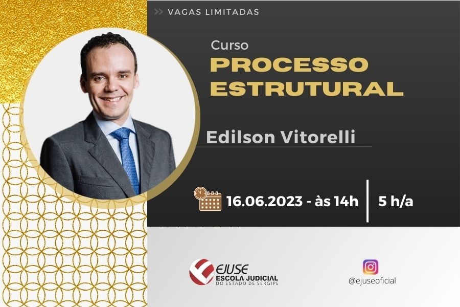 Escola Judicial do Estado de Sergipe (Ejuse) abre inscrições para o curso ‘Processo Estrutural’, que ocorrerá no dia 16/06, a partir das 14h, no Tribunal de Justiça de Sergipe (TJSE), centro de Aracaju. O ministrante será o Desembargador Federal no Tribunal Regional Federal da 6ª Região e Doutor em Direito pela Universidade Federal do Paraná (UFPR), Edilson Vitorelli.