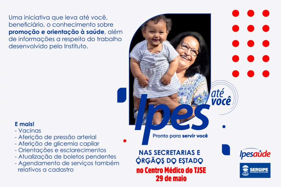 O Instituto de Promoção e de Assistência à Saúde dos Servidores do Estado de Sergipe realizará a campanha "Ipesaúde até você", no Centro Médico do Tribunal de Justiça de Sergipe (TJSE), no dia 29 de maio, segunda-feira, das 8 às 13 horas. Na oportunidade, serão ofertados aos servidores do Judiciário serviços de vacinação, aferição de pressão arterial e glicemia, atualização de boletos pendentes, agendamento de serviços e esclarecimento de dúvidas em relação ao cadastro.