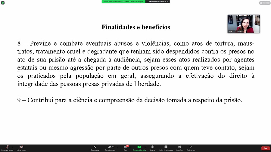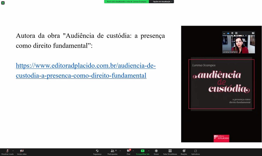 Ocampos é autora do livro ‘Audiência de Custódia: a presença como direito fundamental’, pela Editora Plácido. “Esse livro é resultado da minha dissertação de mestrado. Muitos dados utilizados na palestra são objetos desse estudo. Quem quiser se aprofundar, além da obra em si, há uma rica bibliografia que traz vários artigos e outros livros que li para minha dissertação”, sugeriu a palestrante.
