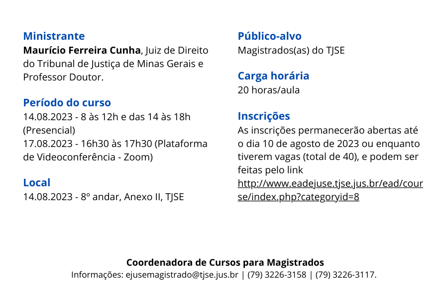 A referida capacitação tem como público-alvo magistrados(as) do Poder Judiciário sergipano, ocorrerá no período de 14 a 28 de agosto de 2023, e será ministrada pelo professor Dr. Maurício Ferreira Cunha.