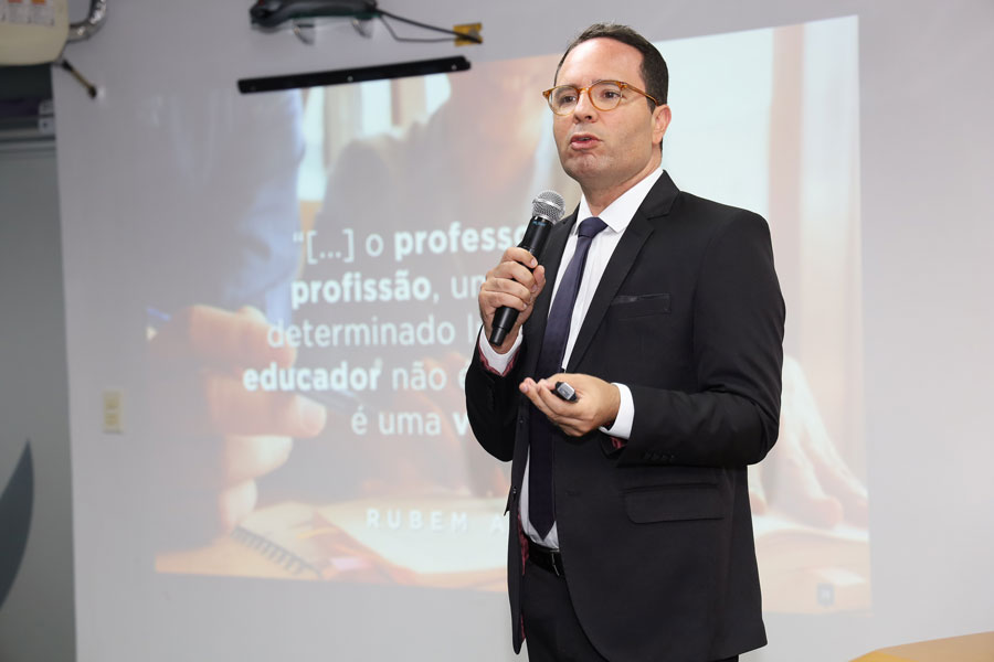 Os presentes assistiram à palestra do psicanalista e servidor do TJSE, Thyago Avelino Santana, sobre o tema ‘Ser como parte do Saber’. A fala de Thyago Avelino trouxe inicialmente uma reflexão acerca do papel do professor e do educador enquanto agentes transformadores das realidades educacionais, no fluxo da construção e reconstrução do saber, e que, segundo ele, “é fluido e metamórfico”.