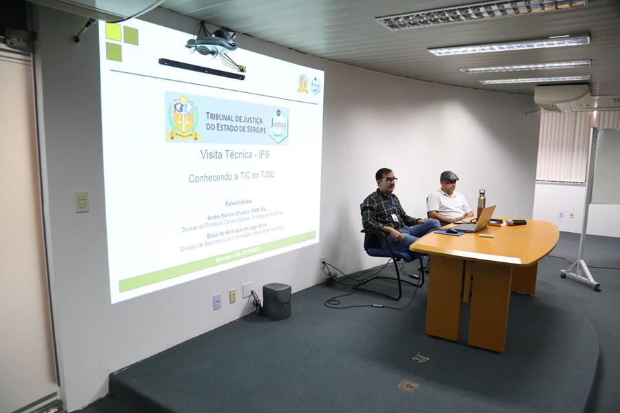 Os servidores André Santos Oliveira (Divisão de Portais e Canais Digitais) e Eduardo Henrique do Lago Silva (Divisão de Segurança da Informação), que também atuam como professores do IFS no campus Itabaiana, apresentaram toda a infraestrutura e funcionamento da Tecnologia do TJSE. "A ideia é aproximar o campo acadêmico do que acontece no mercado de trabalho. E mostrar também para a sociedade o que o tribunal disponibiliza em termos de serviços, desmistificando o serviço público e todo o esforço que é feito aqui para garantir um serviço jurisdicional de excelência", ressaltou André Oliveira.