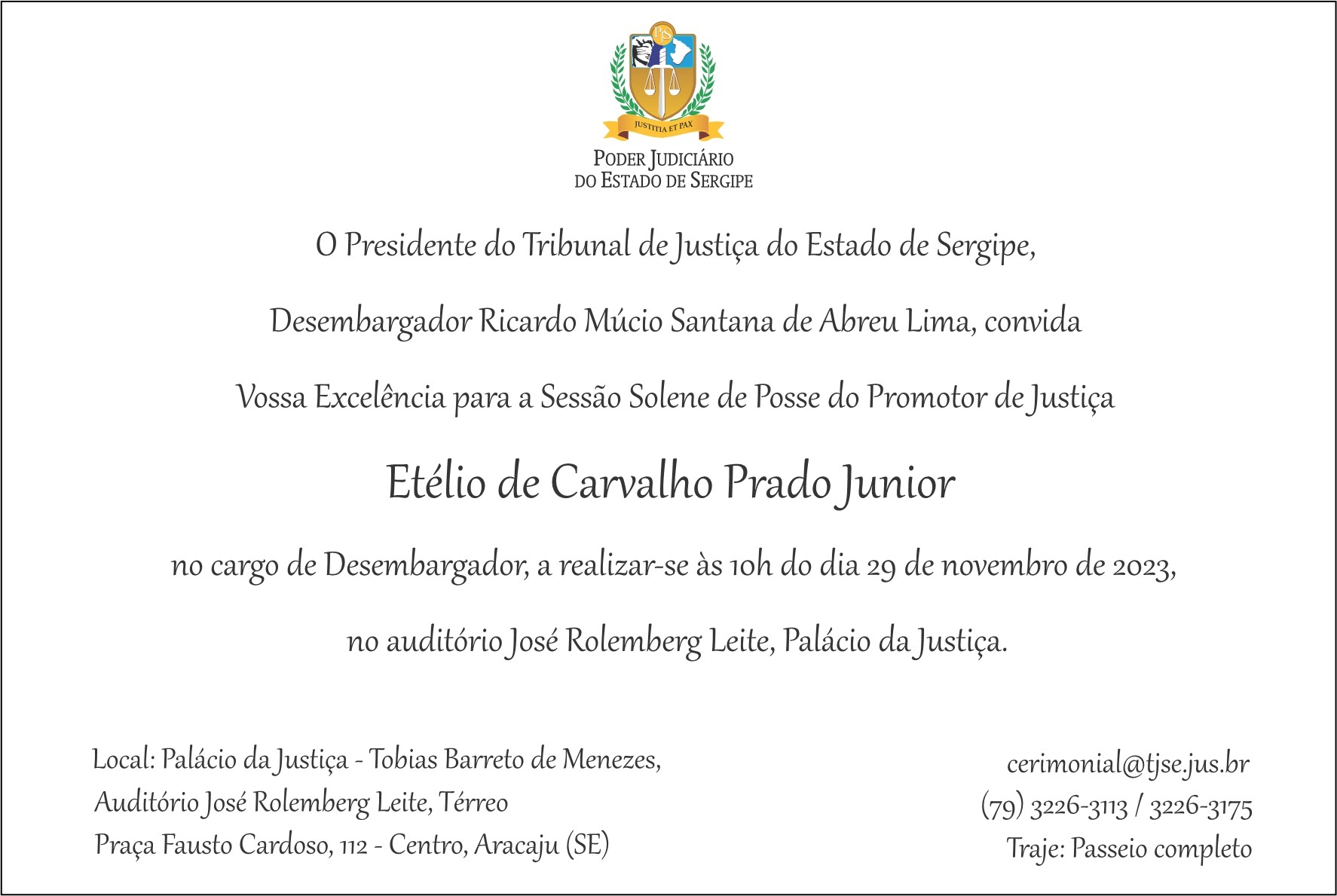 A sessão solene de posse do promotor de Justiça Etélio de Carvalho Prado Junior no cargo de desembargador do Tribunal de Justiça (TJSE), pelo Quinto Constitucional, acontecerá na próxima quarta-feira, 29/11, às 10 horas, no auditório José Rollemberg Leite, no térreo do Palácio da Justiça, à Praça Fausto Cardoso, Centro de Aracaju.