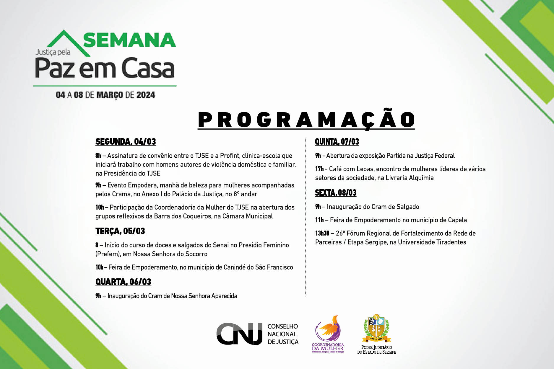 A Coordenadoria da Mulher do Tribunal de Justiça de Sergipe (TJSE) divulgou a programação da Semana da Justiça pela Paz em Casa. Serão realizadas diversas ações na capital e interior, com inaugurações de Centros de Referência de Atendimento à Mulher (Crams), assinatura de convênio, curso no Presídio Feminino, entre outras.