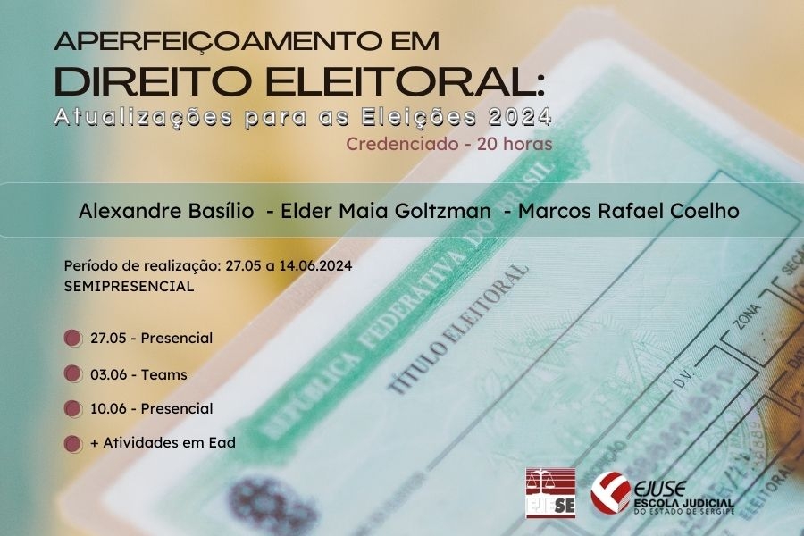 A Escola Judicial de Sergipe (Ejuse), em parceria com a Escola Judiciária Eleitoral de Sergipe (EJE-SE), abre inscrições para o curso ‘Aperfeiçoamento em Direito Eleitoral - Atualizações para as Eleições 2024’. Direcionado para magistrados do Poder Judiciário sergipano, as inscrições podem ser realizadas até 24/05 por meio da Plataforma Ejuseweb. O curso ocorrerá de 27/05 a 14/06 do corrente ano.